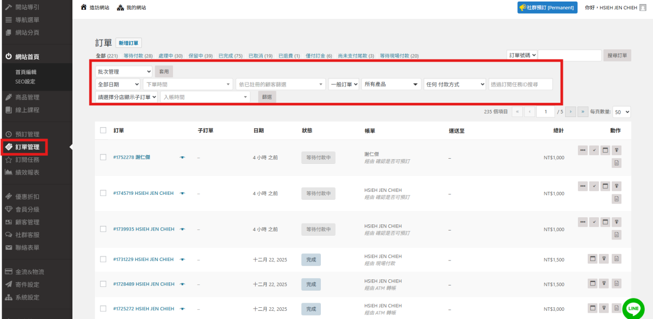 首先進到後台,選擇「訂單管理」,在右方的訂單欄位上方,可以看到「篩選器」,用「日期」、「時間」、「顧客」等方式篩選,若想要快速找到某樣類型的資料,可以使用此功能。