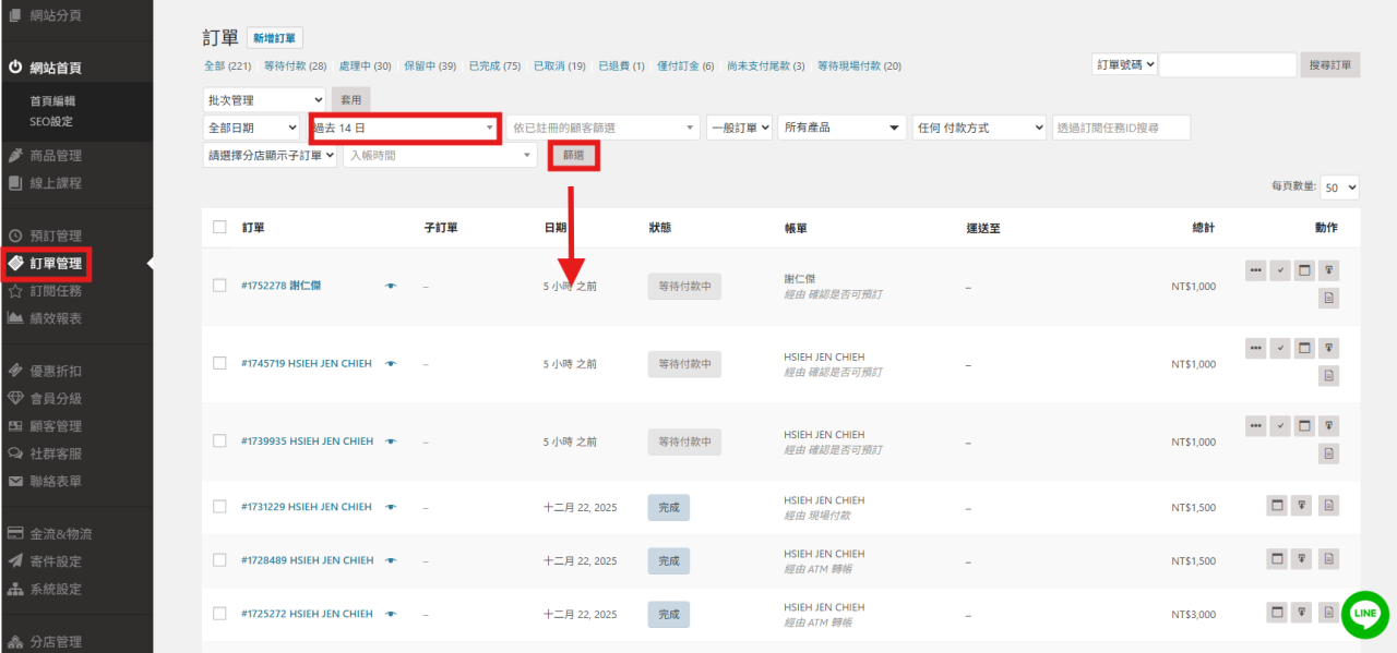 例如輸入過去14日的訂單範圍,再按下篩選,即可篩出想要的訂單資料